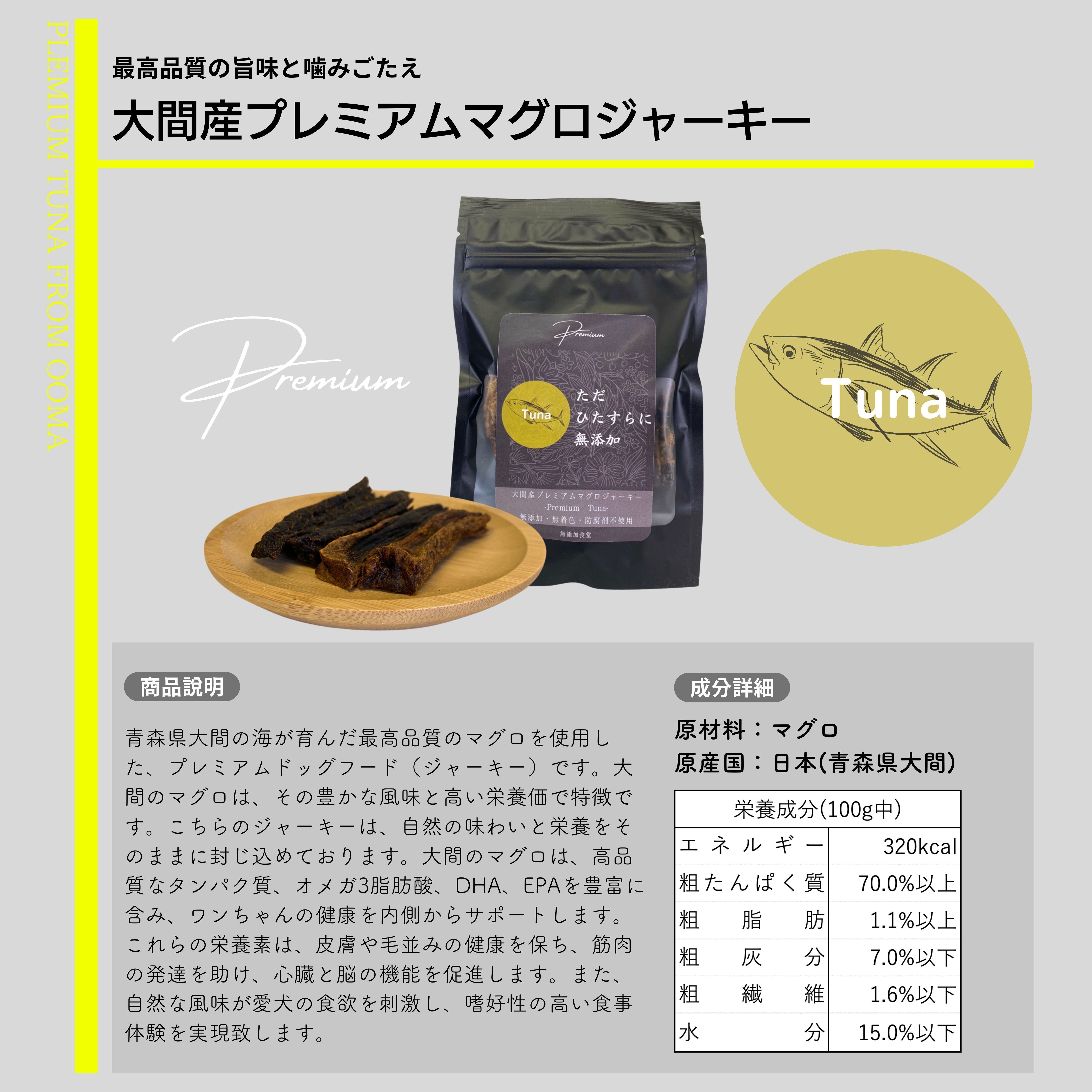 ⻘森県⼤間の海が育んだ最⾼品質のマグロを使⽤した、プレミ アムドッグフード(ジャーキー)です。⼤間のマグロは、その 豊かな⾵味と⾼い栄養価で特徴です。こちらのジャーキーは、 ⾃然の味わいと栄養をそのままに封じ込めております。⼤間の マグロは、⾼品質なタンパク質、オメガ3脂肪酸、DHA、EPAを 豊富に含み、ワンちゃんの健康を内側からサポートします。こ れらの栄養素は、⽪膚や⽑並みの健康を保ち、筋⾁の発達を助 け、⼼臓と脳の機能を促進します。また、⾃然な⾵味が愛⽝の ⾷欲を刺激し、嗜好性の⾼い⾷事体験を実現致します。