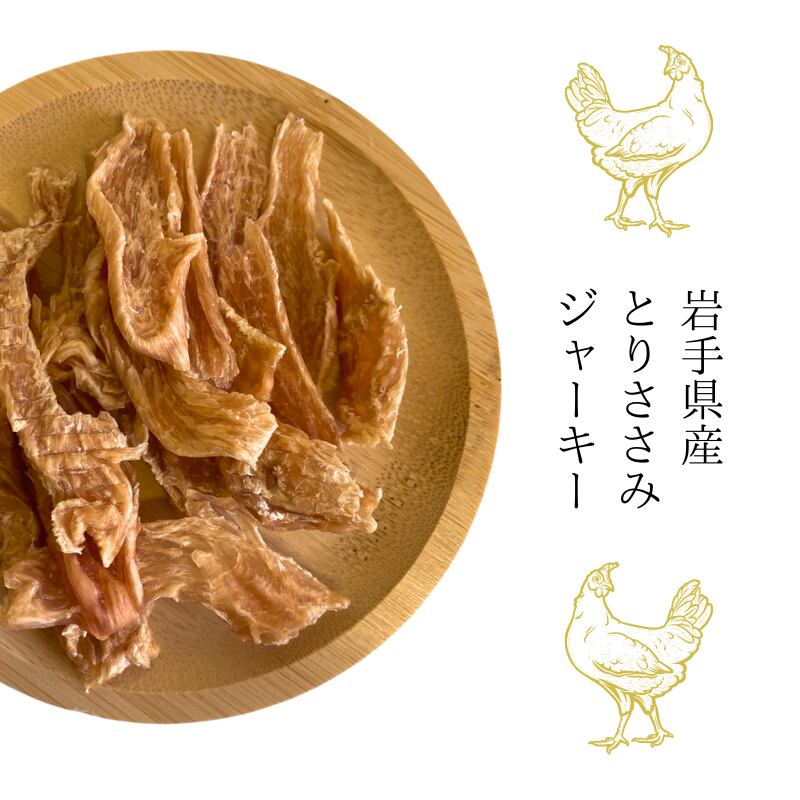 岩⼿県産の新鮮な鶏ささみを主原料に使⽤した、ジャーキータ イプのおやつです。岩⼿県の鶏ささみは、⾼品質なタンパク質 を豊富に含み、愛⽝の筋⾁の健康をサポートします。また、消化が良く、低脂肪であるため、敏感な愛⽝や体重管理が必要な ワンちゃんにもおすすめです。鶏ささみの⾃然な⾵味と栄養を そのまま提供致します。噛むことで⻭の健康にも良い影響を与 え、⻭⽯の蓄積を減らす効果が期待できます。鶏ささみ⾁は柔 らかく、消化しやすいため、敏感な胃を持つ⽝や⾷事制限が必 要な⽝にも適しています。