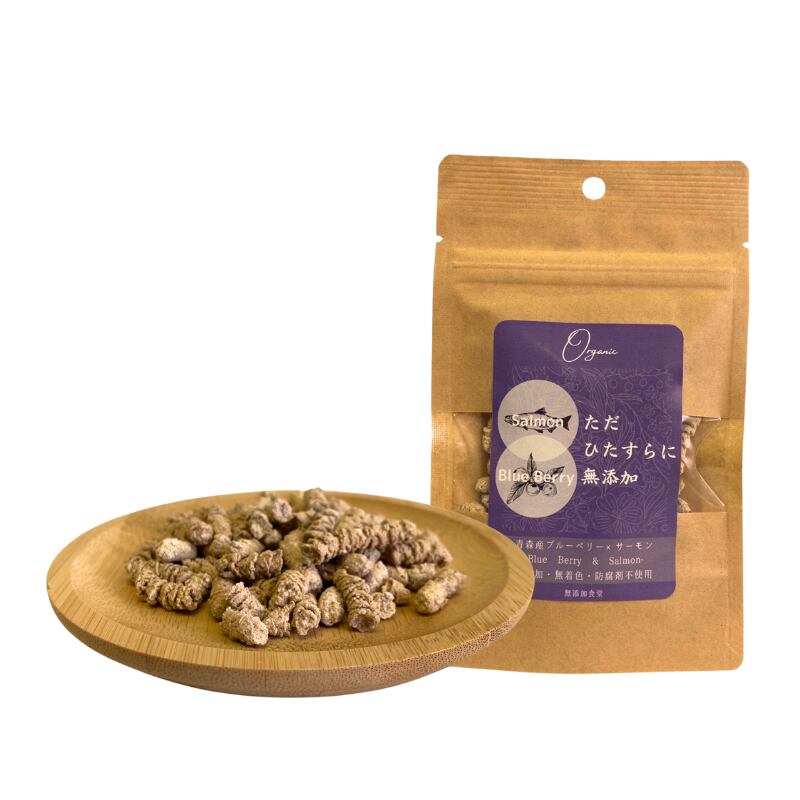 ⻘森県産のサーモンとブルーベリーを使った、⾃然そのままの ⽝⽤おやつです。抗酸化作⽤に優れ、⽬に優しいブルーベリー はビタミンCとビタミンKを豊富に含んでいます。ビタミンCは 免疫システムの強化に貢献し、ビタミンKは⾻の健康と⾎液の 凝固に役⽴ちます。ブルーベリーは低カロリーで脂肪分が少な いため、体重管理が必要なワンちゃんにもおすすめです。サー モンは必須アミノ酸を含む完全なタンパク質源であり、ワンち ゃんの健康的な成⻑と維持を助けます。