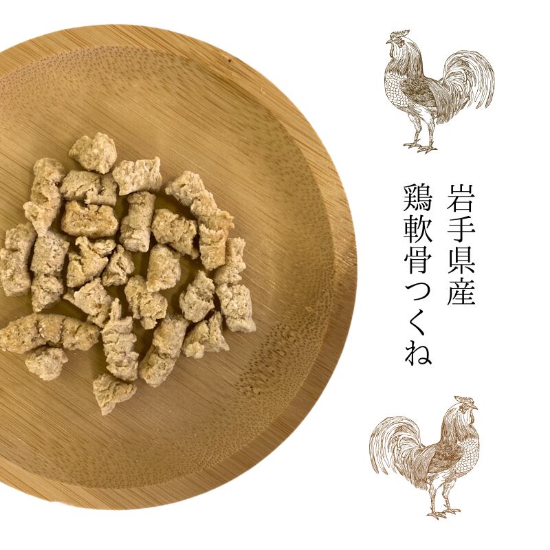 当社の⽝⽤おやつは、岩⼿県産の鶏軟⾻と北海道産ジャガイモ のペレットタイプもおやつです。鶏軟⾻は、関節の健康をサポ ートする重要な成分であるグルコサミンとコンドロイチンを含 んでいます。軟⾻の再⽣を助け、関節液の⽣成を促進し、関節 炎や関節の摩耗などの問題を抱えるワンちゃんの痛みや不快感 を軽減するのに役⽴ちます。鶏軟⾻は噛むことで愛⽝の⻭の健 康を維持する効果も期待できます。⼀⽅、北海道産ジャガイモ は、⾃然な⽢さと⾷物繊維を提供し、消化促進に役⽴ちます。