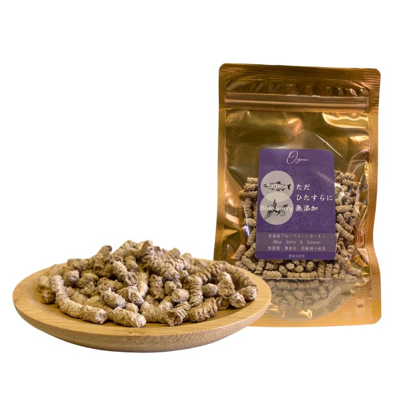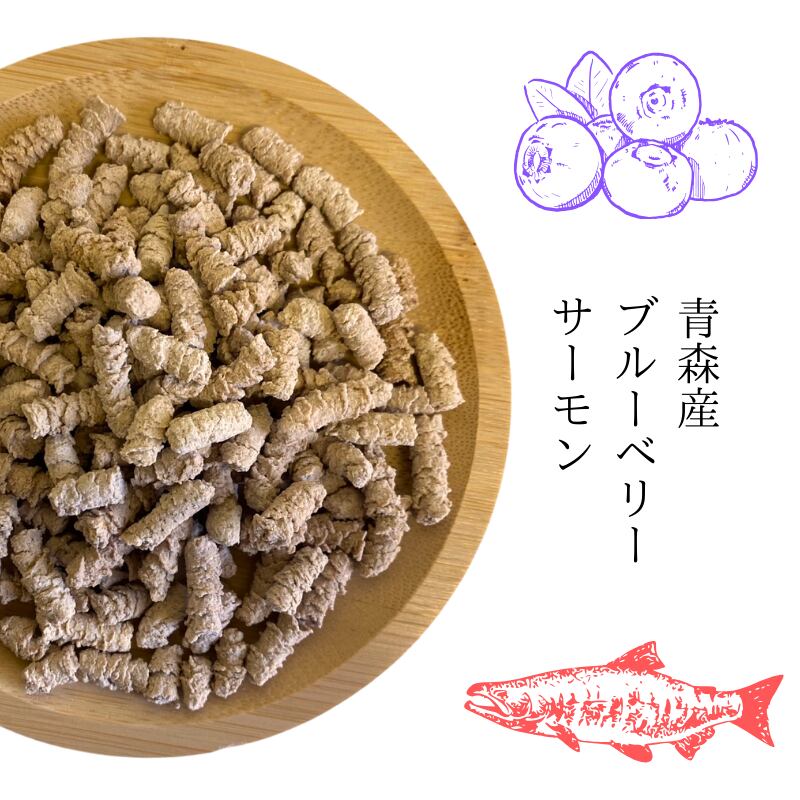 ⻘森県産のサーモンとブルーベリーを使った、⾃然そのままの ⽝⽤おやつです。抗酸化作⽤に優れ、⽬に優しいブルーベリー はビタミンCとビタミンKを豊富に含んでいます。ビタミンCは 免疫システムの強化に貢献し、ビタミンKは⾻の健康と⾎液の 凝固に役⽴ちます。ブルーベリーは低カロリーで脂肪分が少な いため、体重管理が必要なワンちゃんにもおすすめです。サー モンは必須アミノ酸を含む完全なタンパク質源であり、ワンち ゃんの健康的な成⻑と維持を助けます。