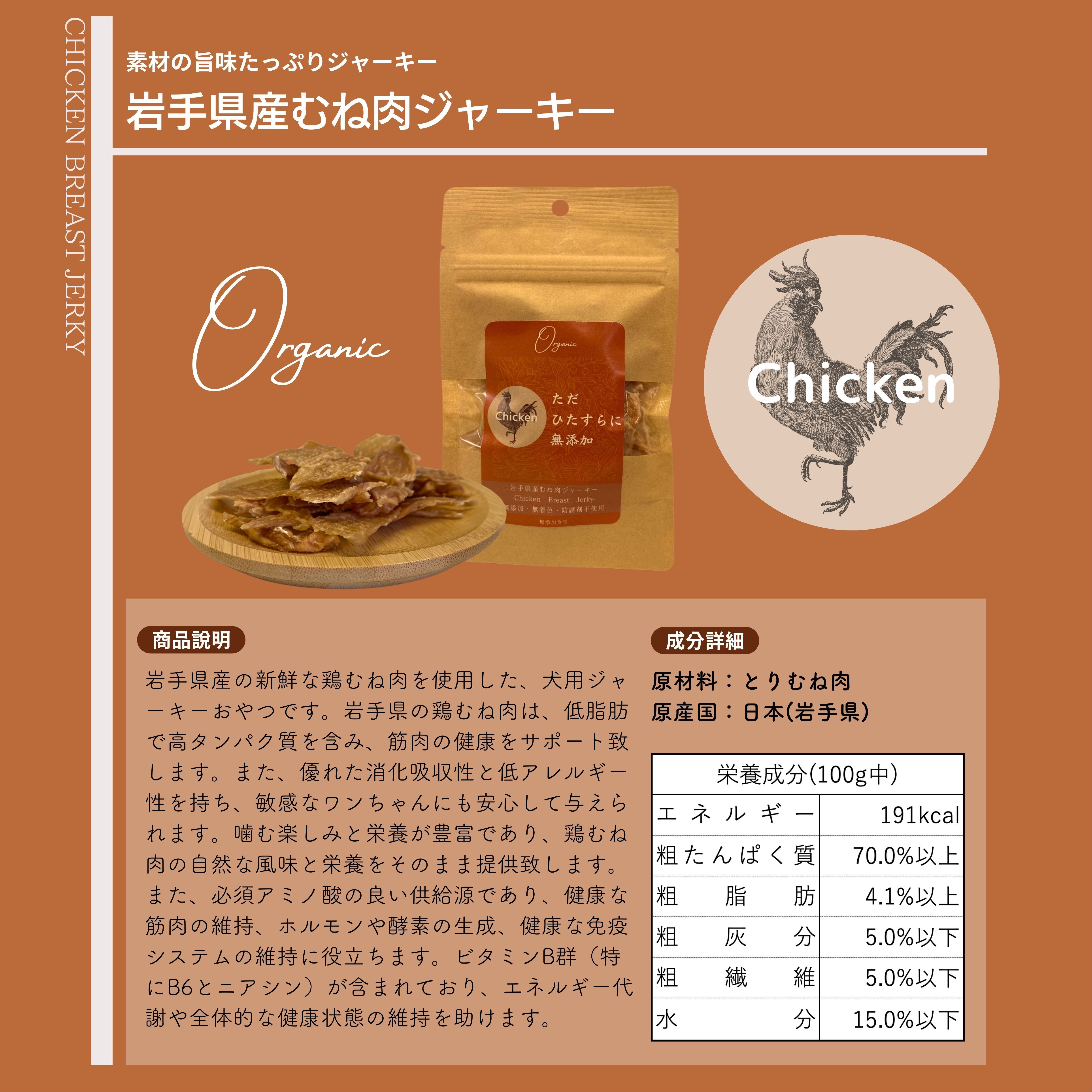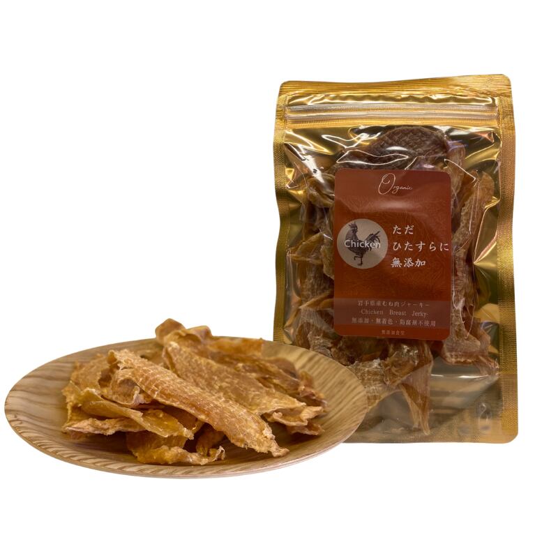 岩⼿県産の新鮮な鶏むね⾁を使⽤した、⽝⽤ジャーキーおやつ です。岩⼿県の鶏むね⾁は、低脂肪で⾼タンパク質を含み、筋 ⾁の健康をサポート致します。また、優れた消化吸収性と低ア レルギー性を持ち、敏感なワンちゃんにも安⼼して与えられま す。噛む楽しみと栄養が豊富であり、鶏むね⾁の⾃然な⾵味と 栄養をそのまま提供致します。また、必須アミノ酸の良い供給 源であり、健康な筋⾁の維持、ホルモンや酵素の⽣成、健康な 免疫システムの維持に役⽴ちます。ビタミンB群(特にB6とニ アシン)が含まれており、エネルギー代謝や全体的な健康状態 の維持を助けます。
